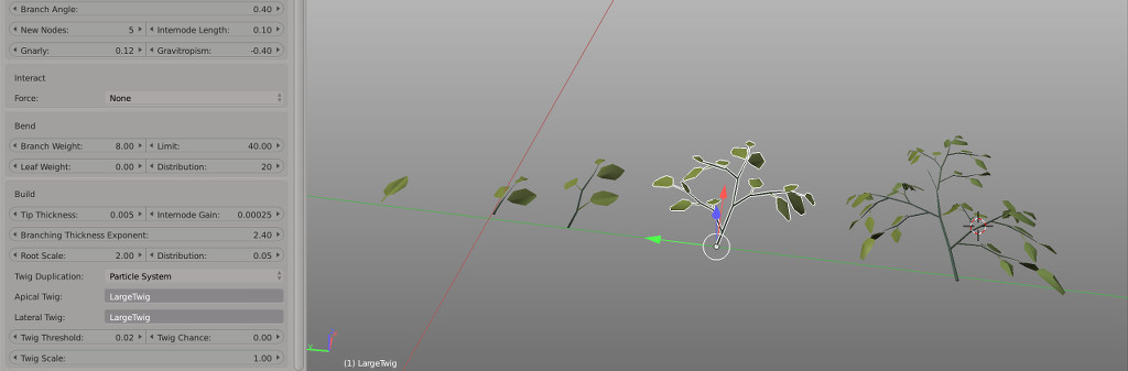 If you’ve created a twig yourself, you may want to list it in the twigs menu so that you can use it in other scenes. You can do this by saving a clean .blend file with just the twigs in the folder that you configured in the user preferences. There is a simple naming convention to follow. You can name your endtwig any way you want, but make sure to end the name with EndTwig in the name. Same for side twigs, end the name with SideTwig. And optionally an UpwardTwig and DeadTwig. If you have a single twig to be used for both the side and end twig, you can just end the name with Twig.