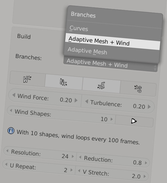 To add wind to your tree, select the new build type Adaptive Mesh + Wind.